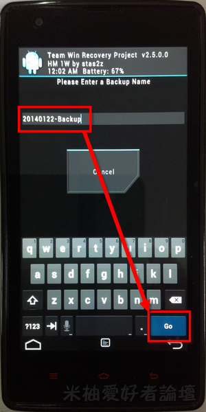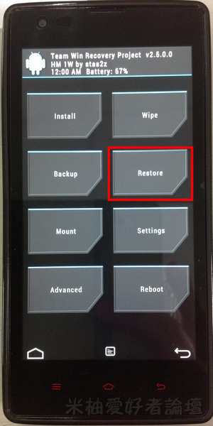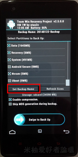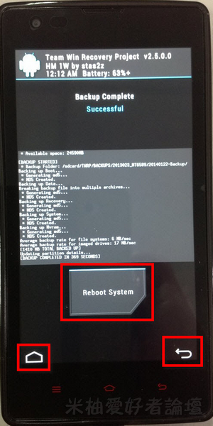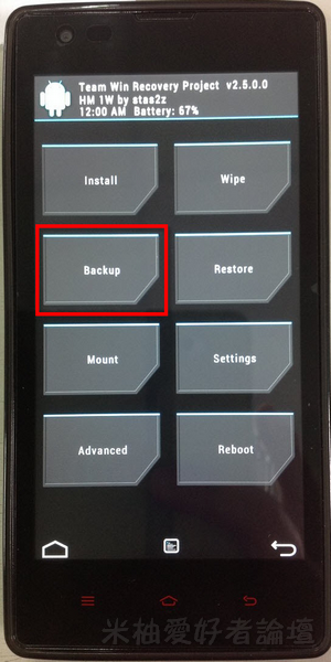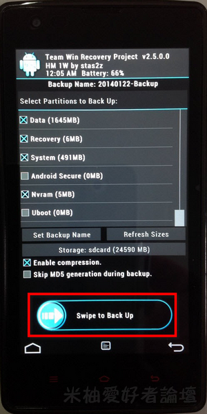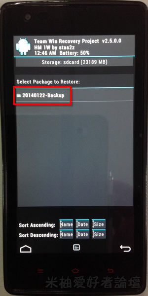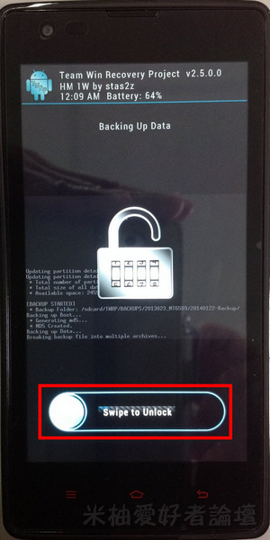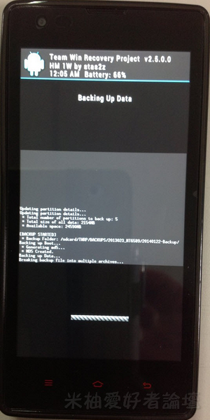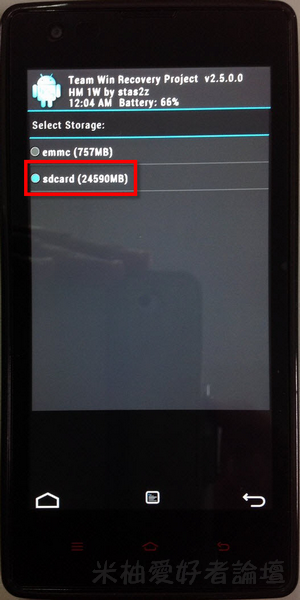 終於可以了~我的HM1W-TWRP-2.5.0.0-stas2z.zip是放在SD卡中